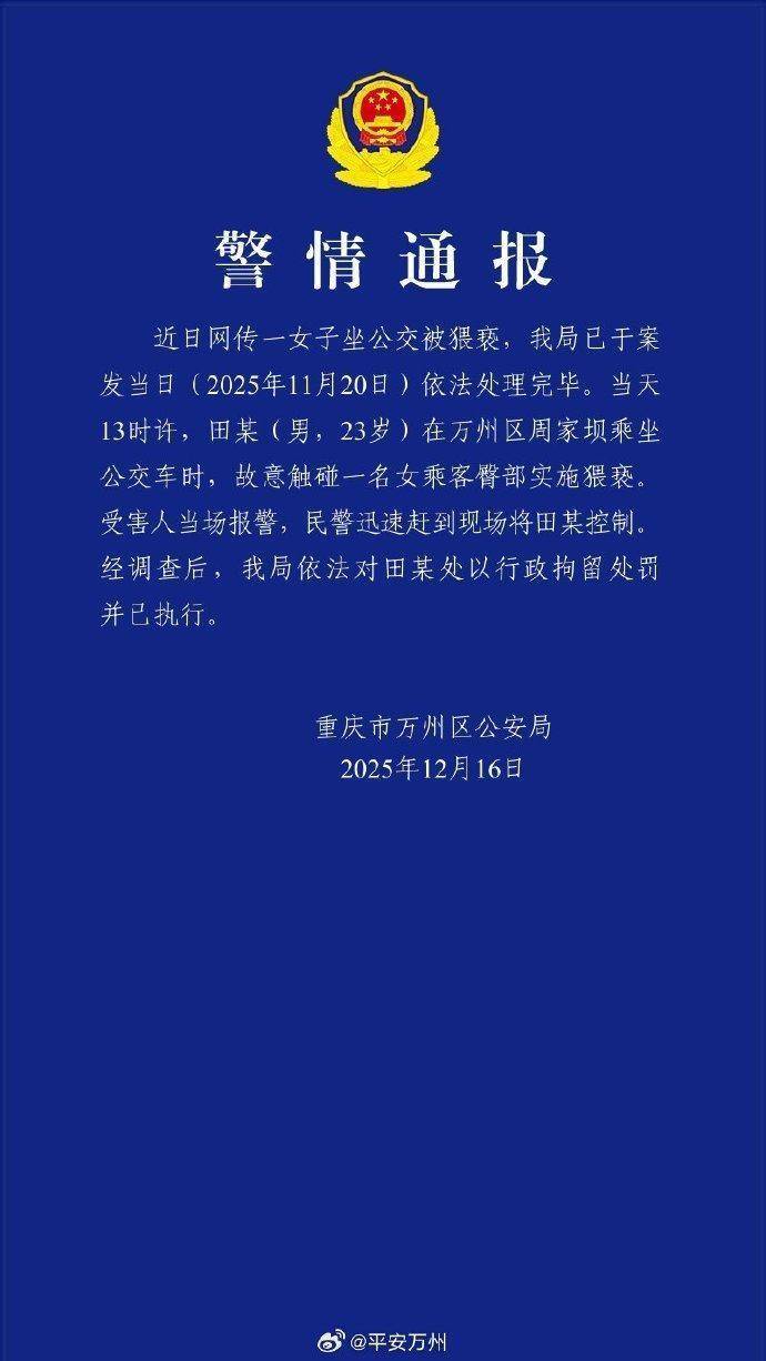 近日网传一女子坐公交被猥亵,我局已于案发当日(2025年11月20日)依法处理完毕。